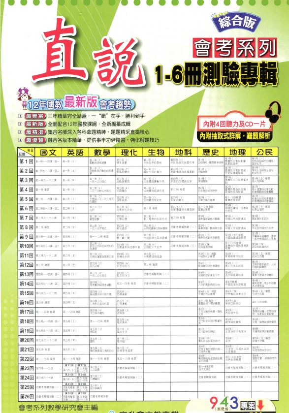 109年 國中會考 高昇鑫 直說測驗卷 綜合版 1-6冊 全科目(含英語聽力測試MP3) 卷類光碟DVD版